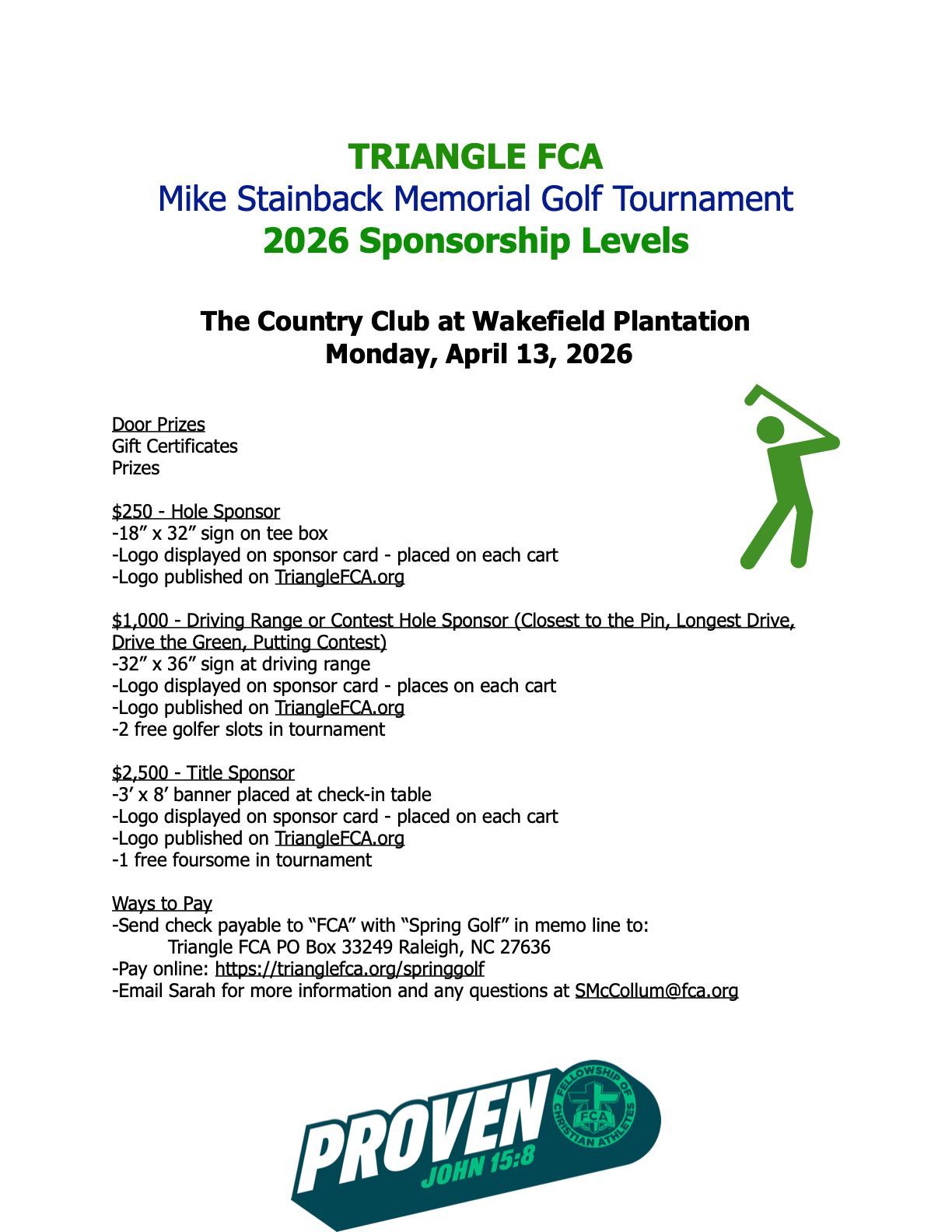 Send check payable to "FCA" with "Spring Golf" in memo line to: